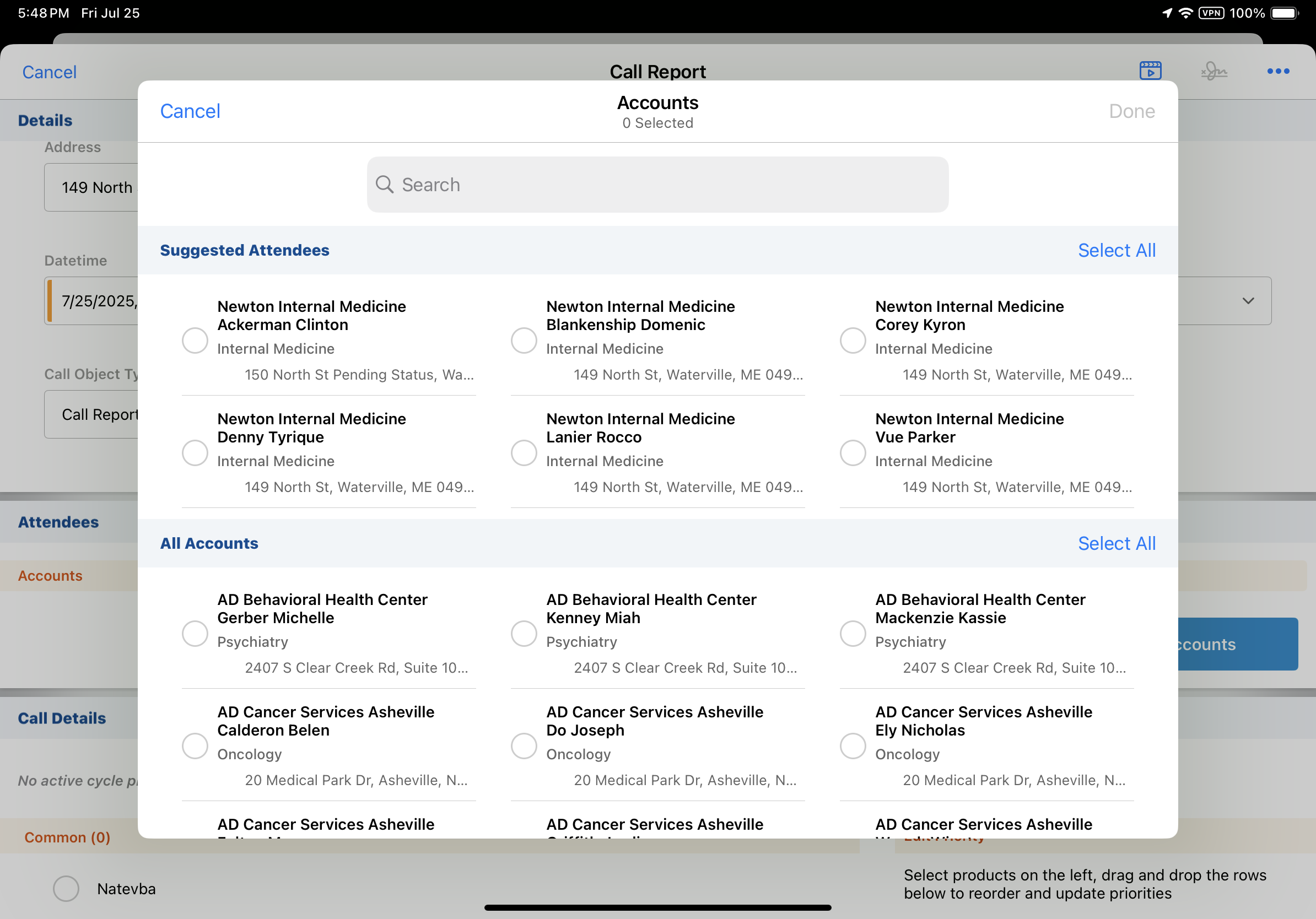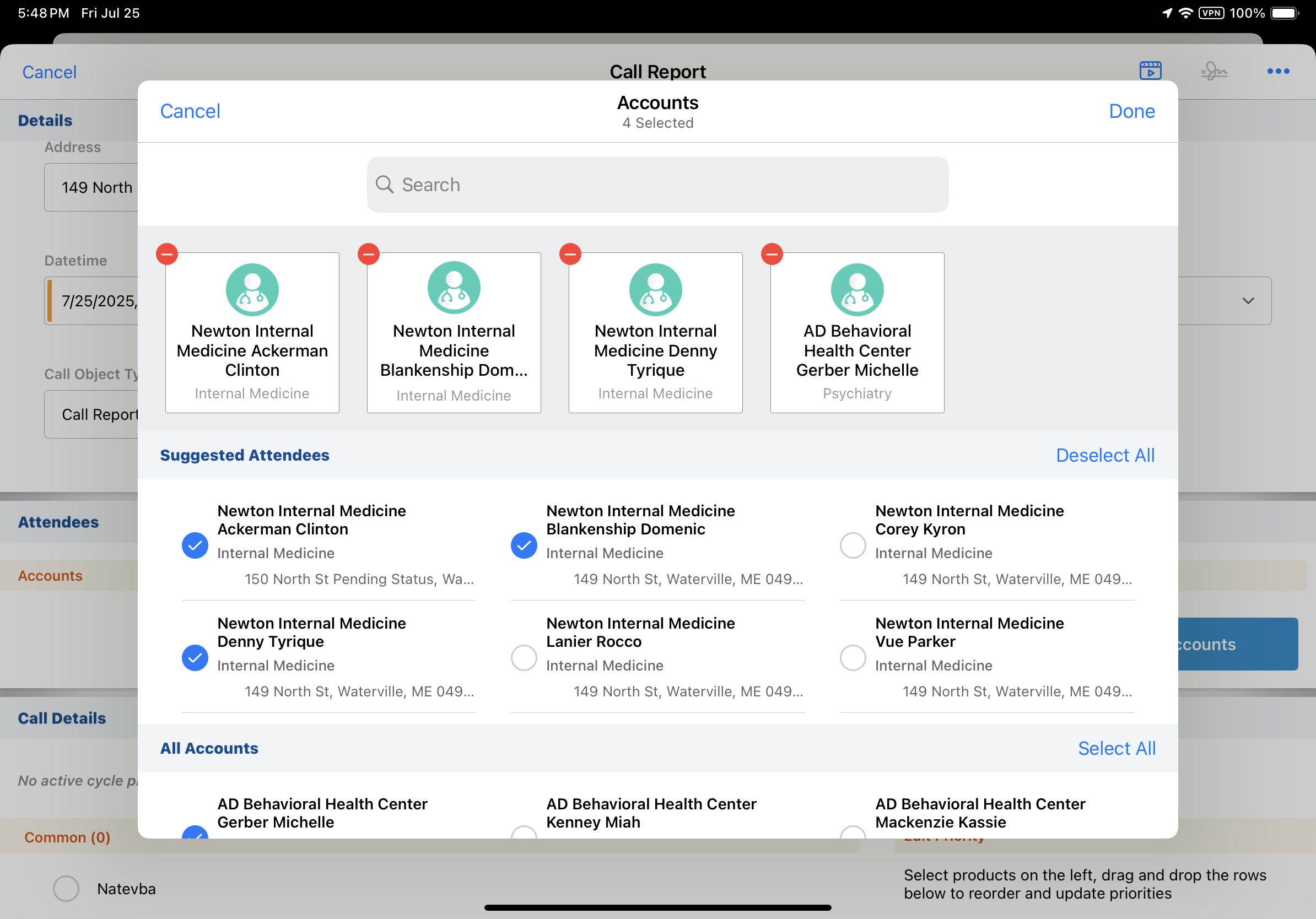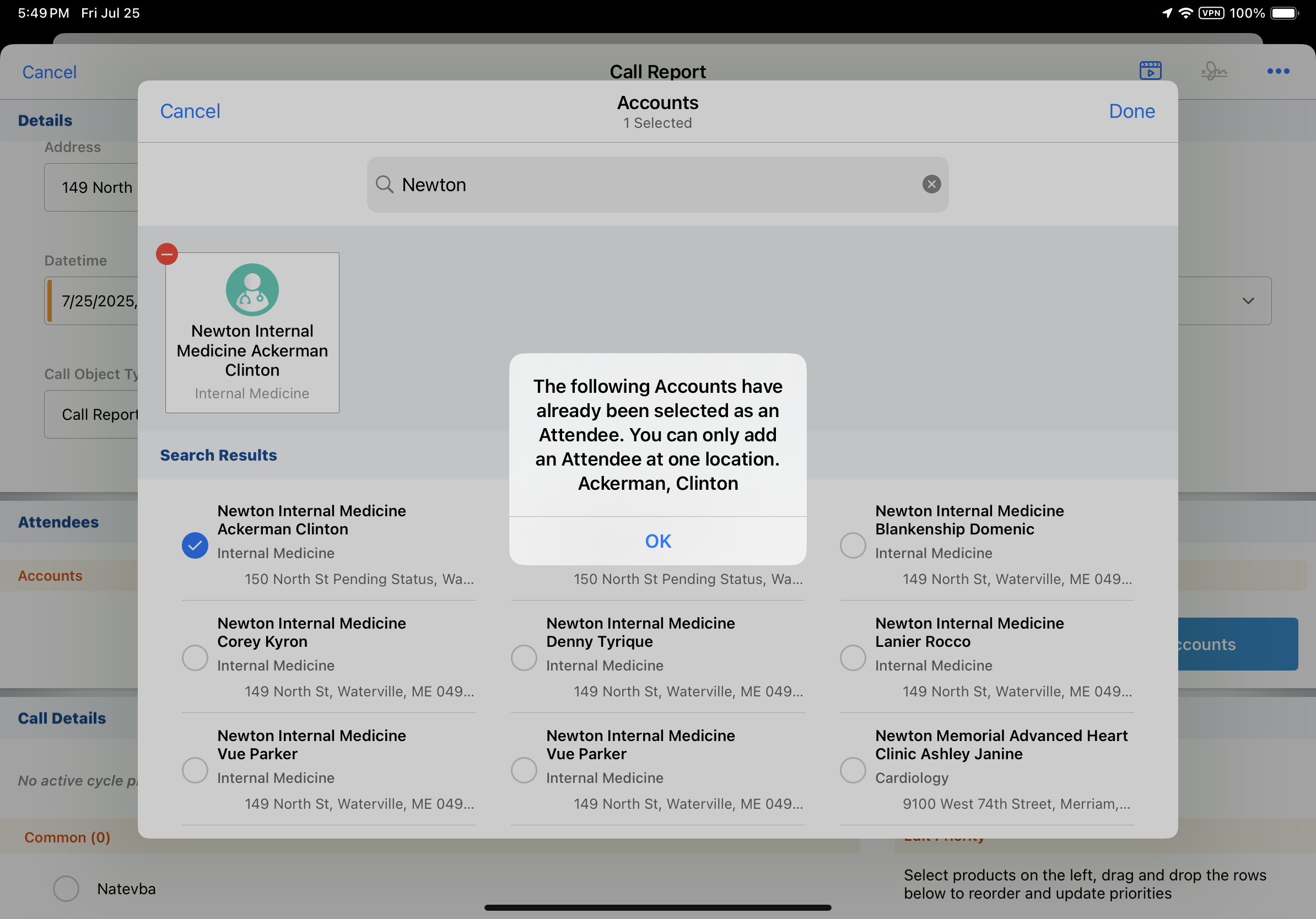 アカウントは、コールレポートに 1 回のみ追加できます。同じ個人アカウントにリンクされている別の子供アカウントがコールレポートで選択されているが、そのアカウントの場所やビジネスアカウントが異なる場合、ユーザーは重複するアカウントをコールレポートに追加することはできません。