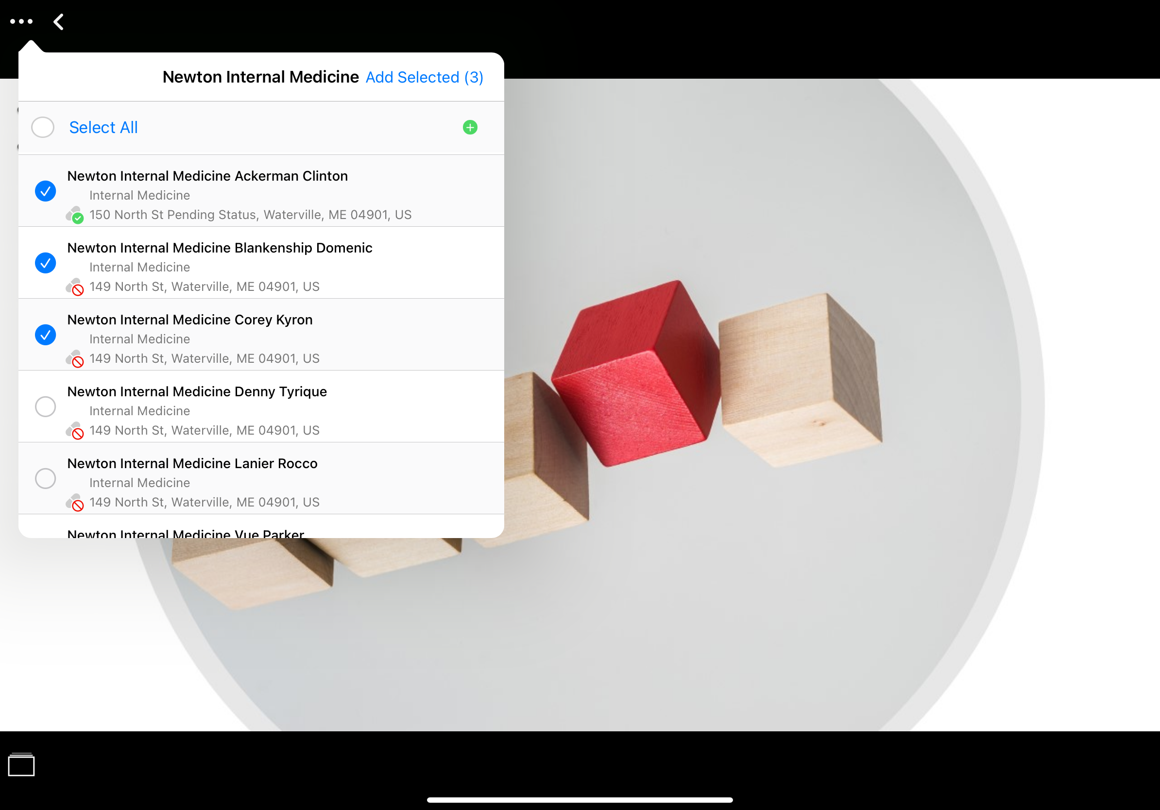 個人アカウントに複数のサブアカウントが存在する場合、関連するすべてのサブアカウントが検索されます。例えば、「Newton Clinton Ackerman」と検索すると、「Newton Clinic Clinton Ackerman」、「Newton Hospital Clinton Ackerman」、および「Newton Urgent Care Clinton Ackerman」が検索結果に表示されます。