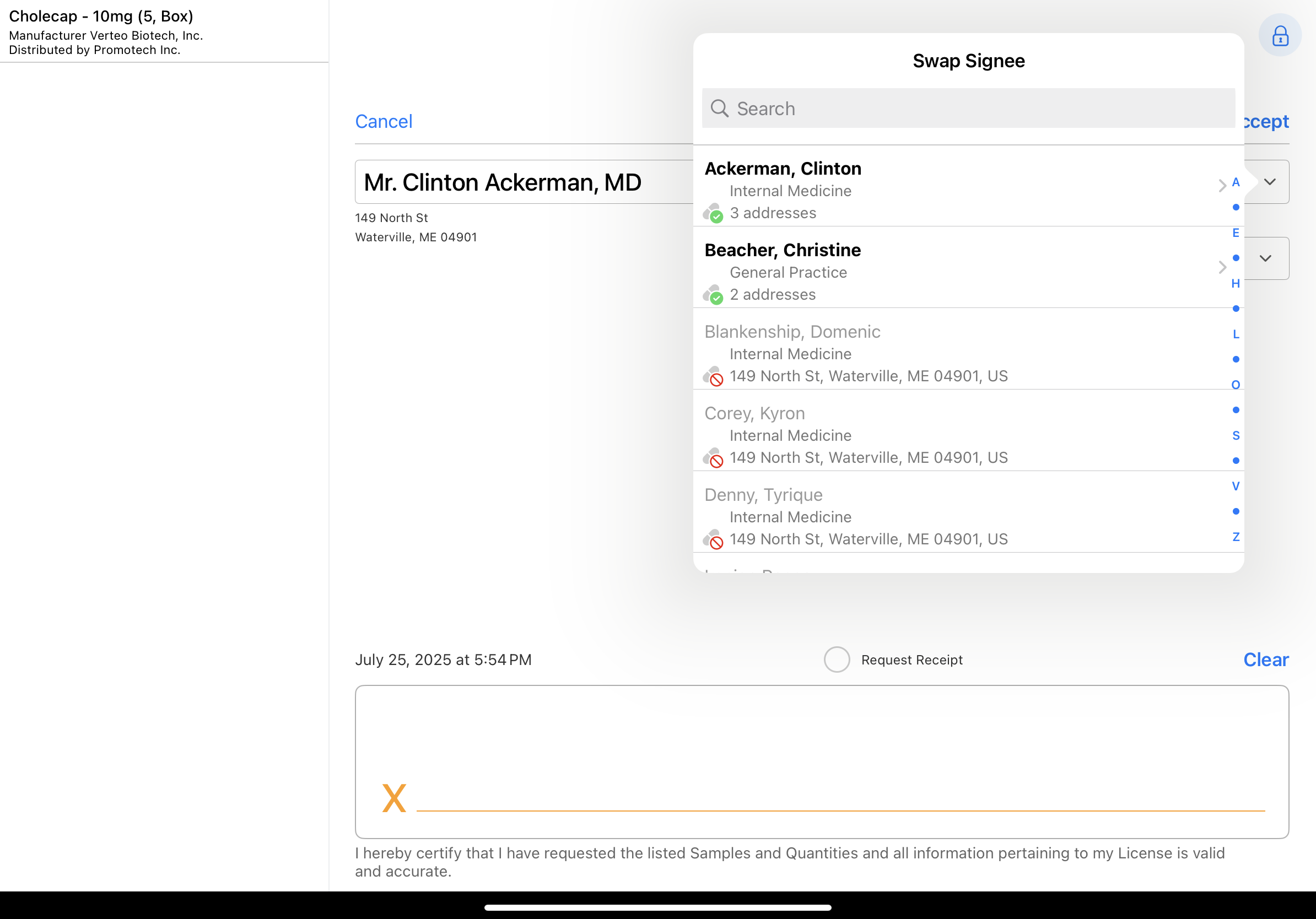 たとえば、ユーザーが「Clinton Ackerman」の個人アカウントコールで Swap Signee(署名者の入れ替え) を選択し、勤務先として「Newton Memorial Hospital」を選んだ場合、Swap Signee モーダルには、主要な親アカウントが Newton Memorial Hospital である個人アカウントが表示されます。「Christine Beacher」とその住所を選択すると、署名者は Newton Memorial Hospital の Christine Beacher の子アカウントに入れ替えられます。