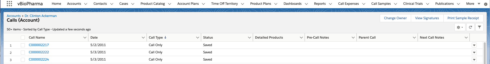 コールレポート提出後、書名は公式記録となるため、ユーザは取得済み署名を表示することはできません。ただし、管理者が監査またはコンプライアンスの目的で署名を表示する必要がある場合があります。管理者は、[署名表示] ボタンを選択して、個人アカウントページおよび/または担当者名簿ページで取得済みの電子署名を表示することができます。